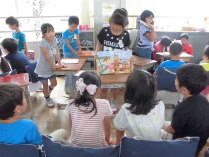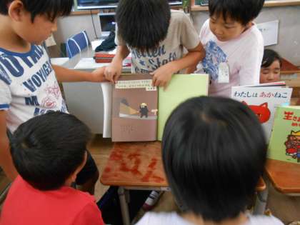 今日は,国語科「つたえよう楽しい学校生活」の学習で一年生に自分たちが選んだ本をブックトークをしました。