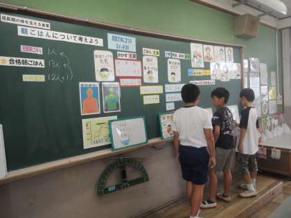 朝ごはんは,ねむっている脳や体を目覚めさせ,勉強したり運動したりするためのエネルギーのもとになるということを学びました。主食・主菜・副菜のそろったバランスの良い朝食をしっかり食べて,元気いっぱいに1日をスタートさせることができるといいですね。