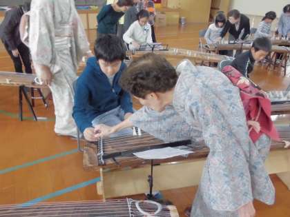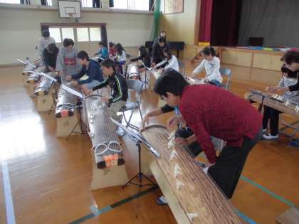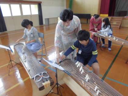 伝統文化の学習でお琴を教えていただきました。とても美しい音色のお琴。触れるのも初めて,演奏するのも初めてです。楽譜の読み方も教えていただき,みんな思い思いにお琴を演奏していました。伝統文化に触れることができ,とても貴重な体験でした。