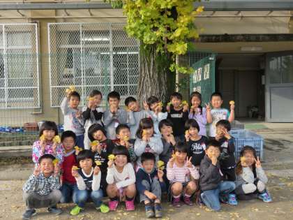 5時間目最後に,運動場のいちょうの木をみんなで観察しました。だいぶ,紅葉がすすんできたようで,とてもきれいな黄色いいちょうの葉をみんなで拾いました。お土産に家に持って帰る子どもたちが多くいました。