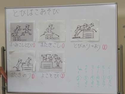 今週は,いよいよ「とびばこあそび」の総仕上げです。3組は,体育館のステージに「とびのる」ことに挑戦する子どもが多く,学習の後半はステージの場にたくさん集まりました。