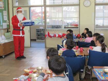 「メリー クリスマス!」と言って,サンタさんが入室!びっくりして言葉を失う子や,「まだ,はやいよ〜」と言い出す子がいて,楽しい雰囲気になりました。