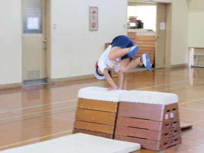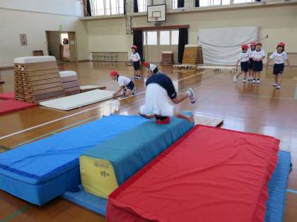気がついたら,遊んでいる中で,台上前転ぽいことができてしまう子どもたちもいて,みんなびっくりして見ていました。