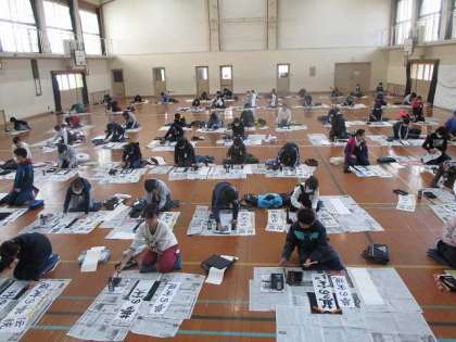 6年生は学年で書初め大会をしました。みんなで集中して体育館で「夢の実現」を書いています。