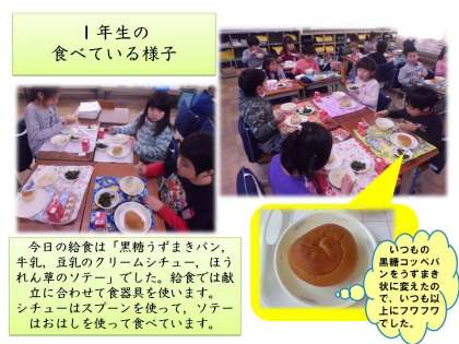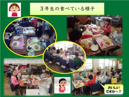 今日は月に数回のパンの日です。3年生と1年生の教室では,おかずのおかわりにたくさん並んでいたり,パンのおかわりをするのにジャンケンをしたりと,みんな食欲旺盛です。担任の先生も「食器が変わると食べる前から美味しそうに見えるね」と子どもたちもうなずいていました。全校で残菜がほぼゼロが2日続き,子どもたちの食べる意欲に作り手の給食調理員さん達も作りがいがあると話されていました。