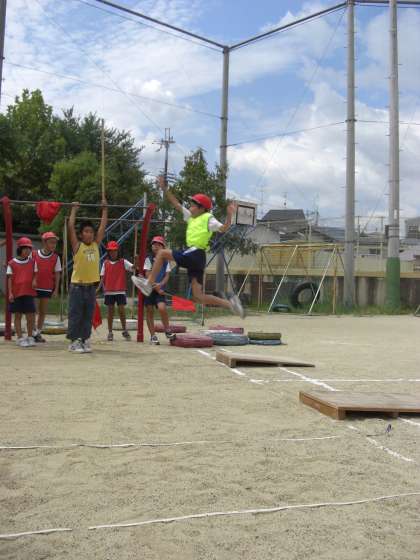 前に跳ぶのでなくより高く跳び出す意識を持つため,高い位置に糸をはりました。