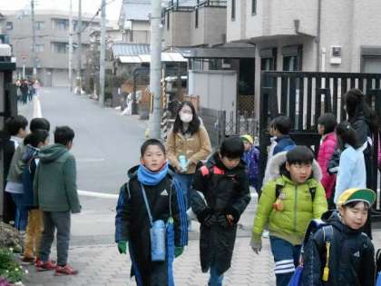 校門で登校してくる友だちに大きな声であいさつします。