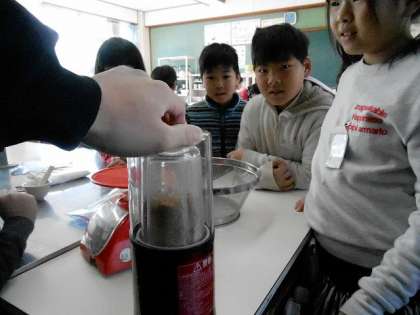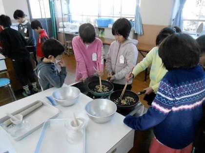 おもちの味付けにきなこを使うため,大豆からきなこを作りました。