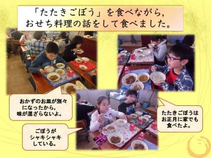 今日の給食にお正月料理の「たたきごぼう」が登場しました。おせち料理には,いろいろな願いが込められている中で,「たたきごぼう」は地中に深く根をはることから,「細く長く幸せに暮らせますように」「長生きできますように」という願いがこめられています。お正月に食べた人もいましたが,食べていない人は給食の「たたきごぼう」をその願いを込めて食べていました。