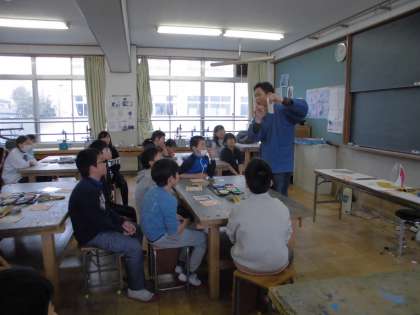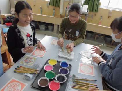友禅染体験をさせていただきました。自分の選んだ柄に,それぞれ思い思いの色をつけていきます。筆を持った子どもたちの顔は真剣そのもので,どんな色の組み合わせにしようかと考えながら,丁寧に色づけをしていました。