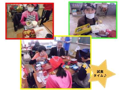 この日は,教育委員会から中学校の乗本首席指導主事と高手課長補佐が来られて,6年生が中学校給食を詰め替えている様子を見た後,一緒に試食していただきました。