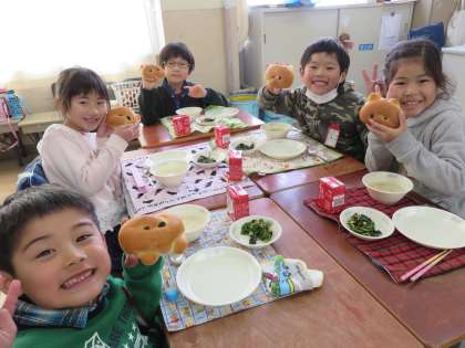 たくさん遊んだ後は,美味しい給食の時間です。今日は,ねこのような形をした「アニマルパン」が登場。レーズンでできた目を見たり,耳の形を見たりして「かわいい!」と言いながら,大喜びで食べていました。そして,今日は少し寒かったので「クリームシチュー」を食べて,体を温めました。