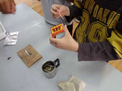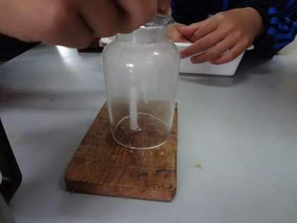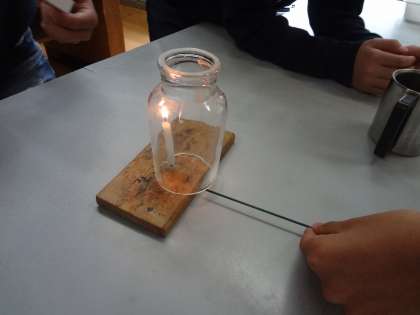 理科「ものの燃え方」の学習で実験をしました。びんの中で物が燃え続けるにはどうしたらいいのかを考えました。空気の流れる様子や,ろうそくの炎の様子をしっかり観察し,実験しました。火をつけるときのマッチの使い方も上手にできました。