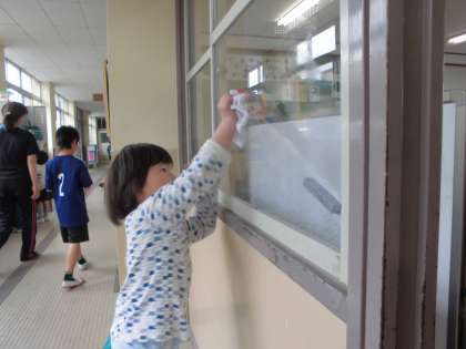 1年生が掃除を頑張ってくれています。お兄さんお姉さんがしている姿を見て,「窓拭く!」ととても張り切って一生懸命拭いてくれました。おかげでぴかぴかです!