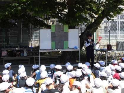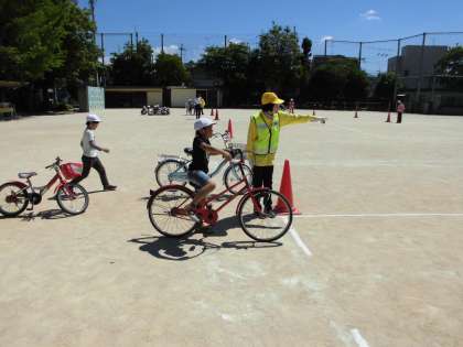 今日は西京警察の方や地域の方,PTAの方が来られ,2年生に「安全に自転車に乗る」教室をしていただきました。暑い中での安全教室でしたが,児童は真剣に話を聞き,自転車のルールやマナーについて学習することができました。その後は自転車に乗り,警察官の方や地域の方々からアドバイスをいただきながら学習することができました。