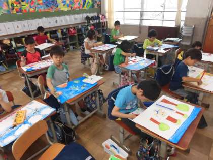 図画工作で,「まほうのとびらをあけると」という学習に取り組んでいます。とびらを開けた世界を想像して描いています。自分の想像した世界を楽しそうに描いているので,完成が楽しみです。