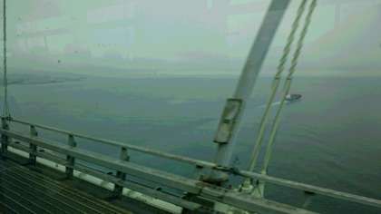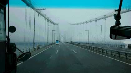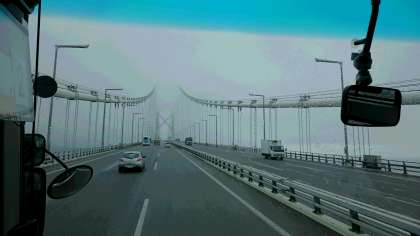 明石海峡大橋を渡りました。雨は小降りですが、雲が低く垂れ込めて、明石海峡大橋の上は雲の中でした。