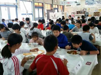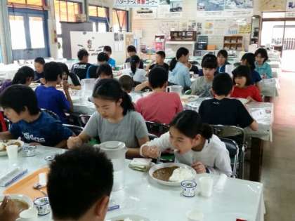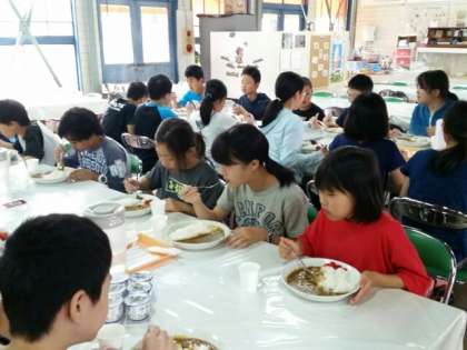 淡路島牧場にてお昼ごはんをいただいています。メニューは「ミルクカレー」子どもたちはみんな、ペロリと完食です。