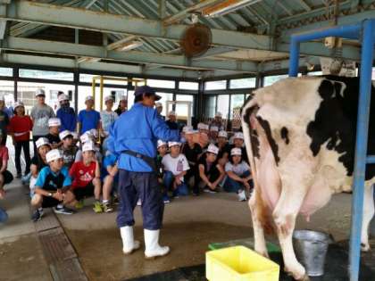 いまから乳搾り体験をします。みんな、おそろいの帽子がよくお似合いです。