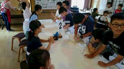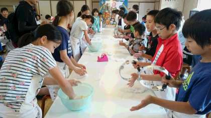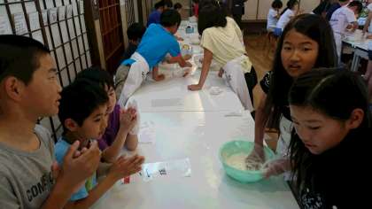 小麦粉に塩水を3回に分けて入れて、軽快な音楽に合わせて混ぜます。