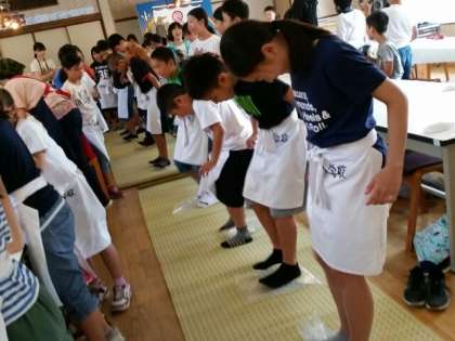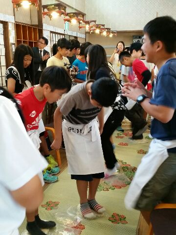 うどんの生地を延ばします。交代で力一杯!タンバリンと音楽で応援します。