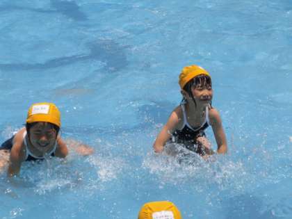 かけっこ,かえるジャンプ,いぬあるき,わにおよぎなどたくさんの水遊びを楽しみました。寒くても我慢強く活動できる1年生に感心しました。