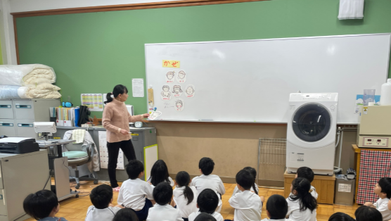 身体計測の前に、保健室の先生が健康についての授業をしてくださります。