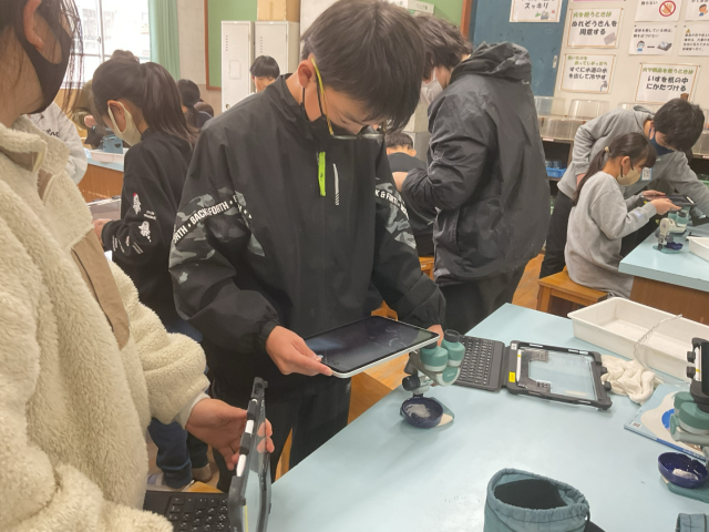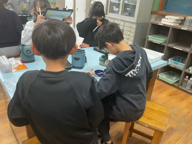 顕微鏡にタブレットのカメラをつけて