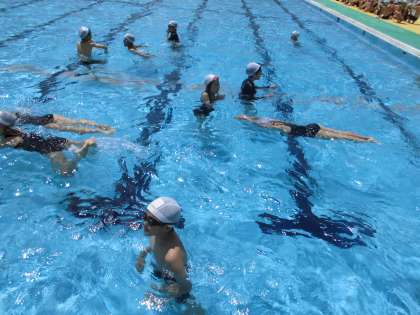 4年生では昨日から水泳の学習が始まりました。4年生では,「より長い距離を,より楽に泳ぐこと」をめあてとして学習を行っています。今日は蹴伸びでどこまで進めるかを確認してみました。