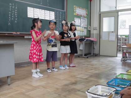 休日参観日に,「おむすびころりん」の音読発表会を行いました。今回は読む文章が多く,振り付けもあり,難しかったのですが,どのグループもたくさん練習をして頑張りました。本番ではかわいいお面をかぶって素敵な音読発表ができました。