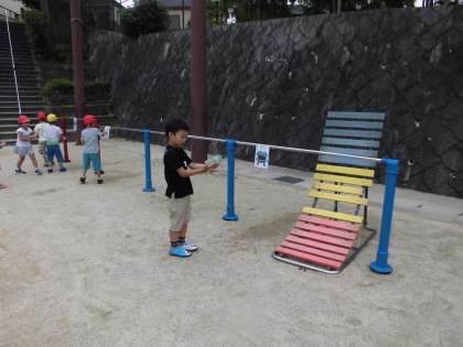 生活科の学習で,おうちにある空き容器などをつかって水でっぽう遊びをしました。運動場のいたるところに付いた宇宙人の的をみんなで楽しく狙いました。遊んでいる中で,容器によって水の飛び方が違うという楽しさにも気づくことができました。