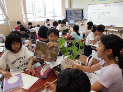 5月に発芽させたインゲンマメを成長させるには,どのような条件が必要か学んでいます。話し合いの中で出た様々な条件のなかから,「日光」と「肥料」を選んでそれらが成長にどのように関わっているのか実験しました。