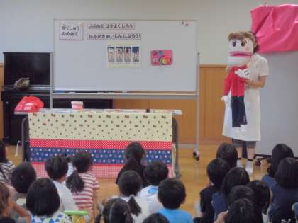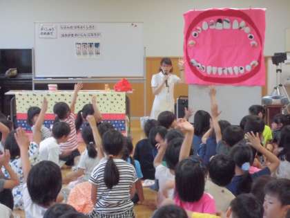 歯科衛生士の稲本先生に来ていただき,正しい食事の仕方や歯みがきの仕方を教えていただきました。最後に,みんなで一緒に歯みがきをしました。
