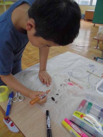 図画工作で「ふんわりふわふわ」をしました。大きなビニール袋に,大好きな「へんしんトンネル」のかっぱや,ボタンの絵を描いて,風を当ててふわふわさせました。