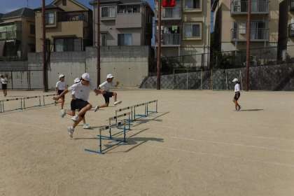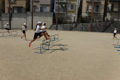 体育科ではハードル走をしました。自分に合ったインターバルを見つけ,より速く走り越すことを目指し,頑張っています。