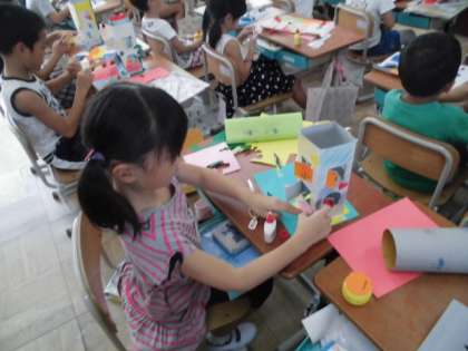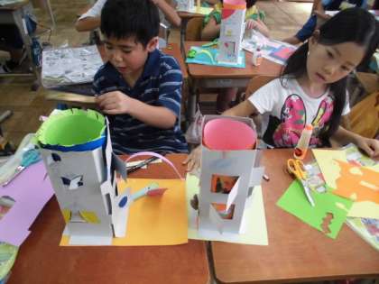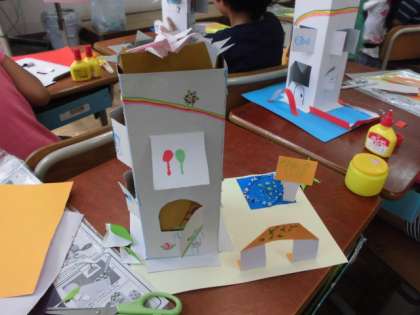 かための紙を橋のようにしたり,折り紙をくっつけて飾り付けたりして楽しんでいます。