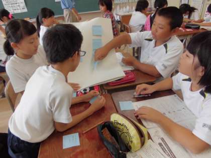 夏休みの間に,自分の「エコライフ」への意識がどのように変わったかを,先生方に作成していただいた診断書をもとに確かめた後,今後の「エコライフチャレンジ目標」を班で協力して作り,発表しました。