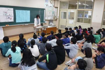国語科の「やまなし」では,自分の感じたことが伝わる朗読発表会をゴールとして学習しています。今日は学校司書の田原先生に来ていただき,ブックトークをしてもらいました。「風の又三郎」「どんぐりと山猫」など宮沢賢治作品の紹介や,様々な「オノマトペ」について話を聞かせてもらいました。子どもたちも宮沢作品に興味深々です。