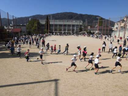 11月14日に予定されている持久走大会に向けて全校で中間マラソンに取り組んでいます。初日は秋晴れの気持ちのいい空の下で,子どもたちは3分間を力いっぱい走っていました。