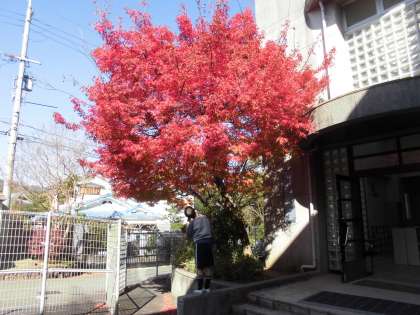 北玄関前のカエデが色づいています。