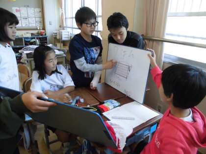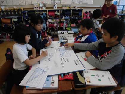 面積の学習では,これまでに習ったことを生かして新しい形の面積を求めることに取り組みました。新しい形でもみんなで知恵を合わせたら解けることに楽しさを感じているようで,いきいきと話し合っていました。