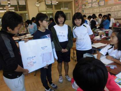 班で考えたことを伝え合う場面でも,分かりやすく伝える工夫をしている班がたくさんありました。どの班の考えにも,これまでに学習したことがきちんと生かされていました。