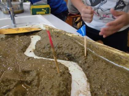 小さな川をつくり,流れる水にはどんなはたらきがあるのか実験しました。水の流れる時間は一瞬。その一瞬に集中して,じっくり観察していました。また各班のチームワークもばっちり。それぞれが役割を見つけて楽しく安全に実験ができました。