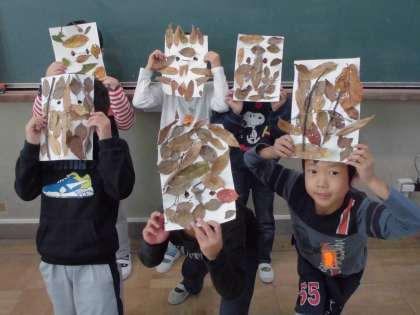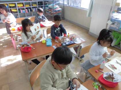 校内で拾った落ち葉を使って,かんむりやお面を作りました。