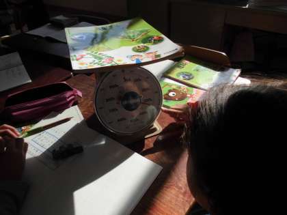 算数の教科書の重さは何グラムかを予想して,はかりで量ってみました。