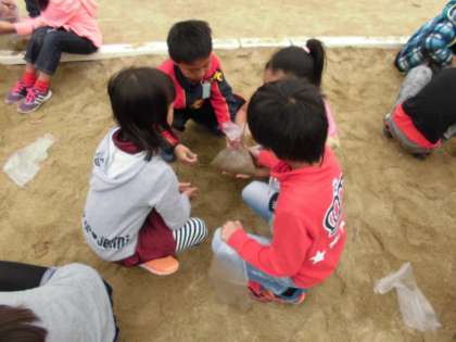袋の中に砂を入れて1kgの重さを作りました。量感を大事にしながら,砂を入れていました。1kgは思ったよりもたくさん砂が必要だとわかりました。