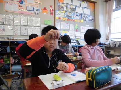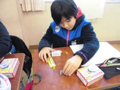 自分たちの作った電磁石に鉄釘がつくかどきどき・・・。電磁石に鉄釘がつくと,思わず笑みがこぼれていました。