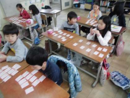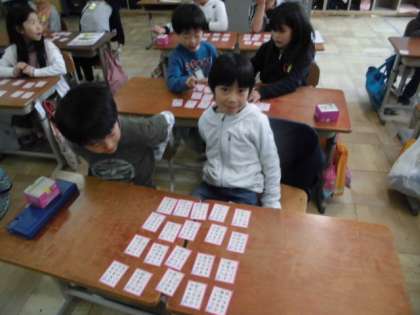 慣れてくるにつれ,冒頭だけで札をとる「最強の1枚」を着々と増やしています。百人一首係も大活躍しています。