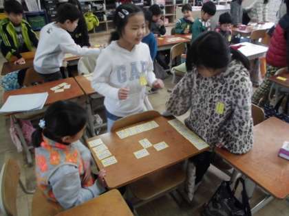 百人一首を楽しんでいます。上の句だけでとれる札を「最強の一枚」と呼び,みんな必死になって覚えています。