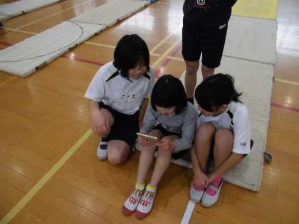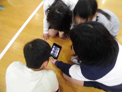 マット運動の学習で活躍しているのが,自分たちの動きを撮ることができるタブレット。着手の仕方や足の動きを確認しながら,互いにアドバイスしていました。